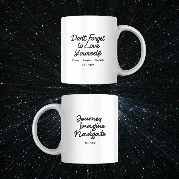 Taza de cerámica con diseño impreso en frente y dorso.